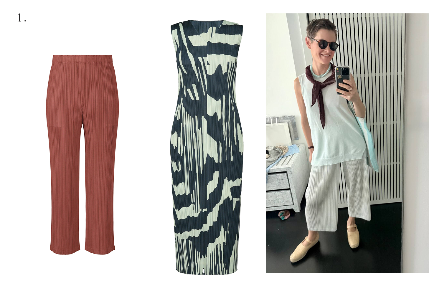 I own a lot of Pleats Please. These clothes are the best packing hack: They pack up to nothing, they don’t wrinkle, and they flatter most everybody. I usually have at least one to two pairs of pants and dresses in my bag and they take up minimal space. Try the pants in a fun yet neutral color like terracotta, and don’t be scared of a statement dress if it packs up small. This dress is the type of cool look friends will remember (and wonder, how did she pack in a carry-on?). I own a similar version that’s been out on dates in the city and acted as a cover-up in the Caribbean.